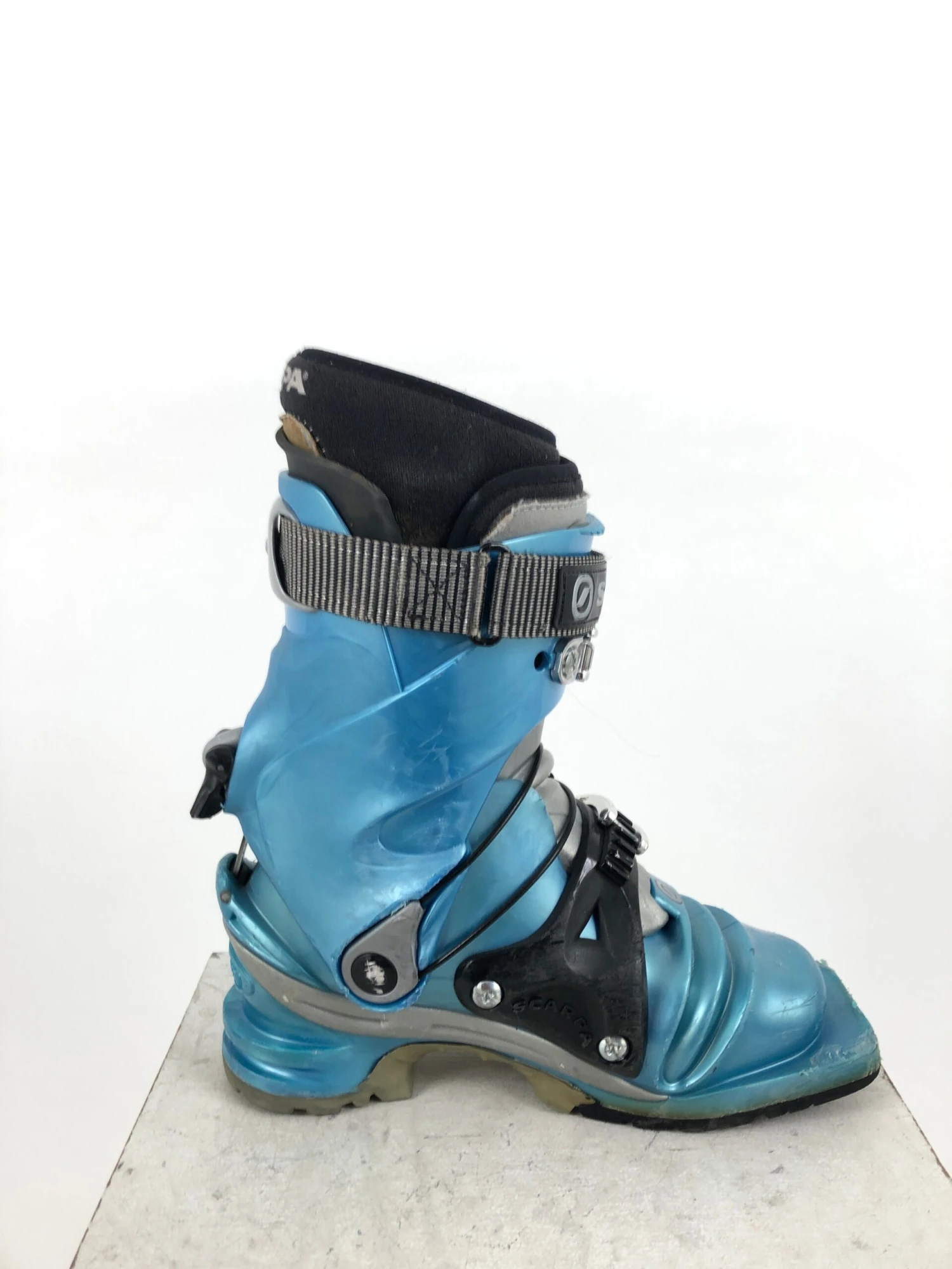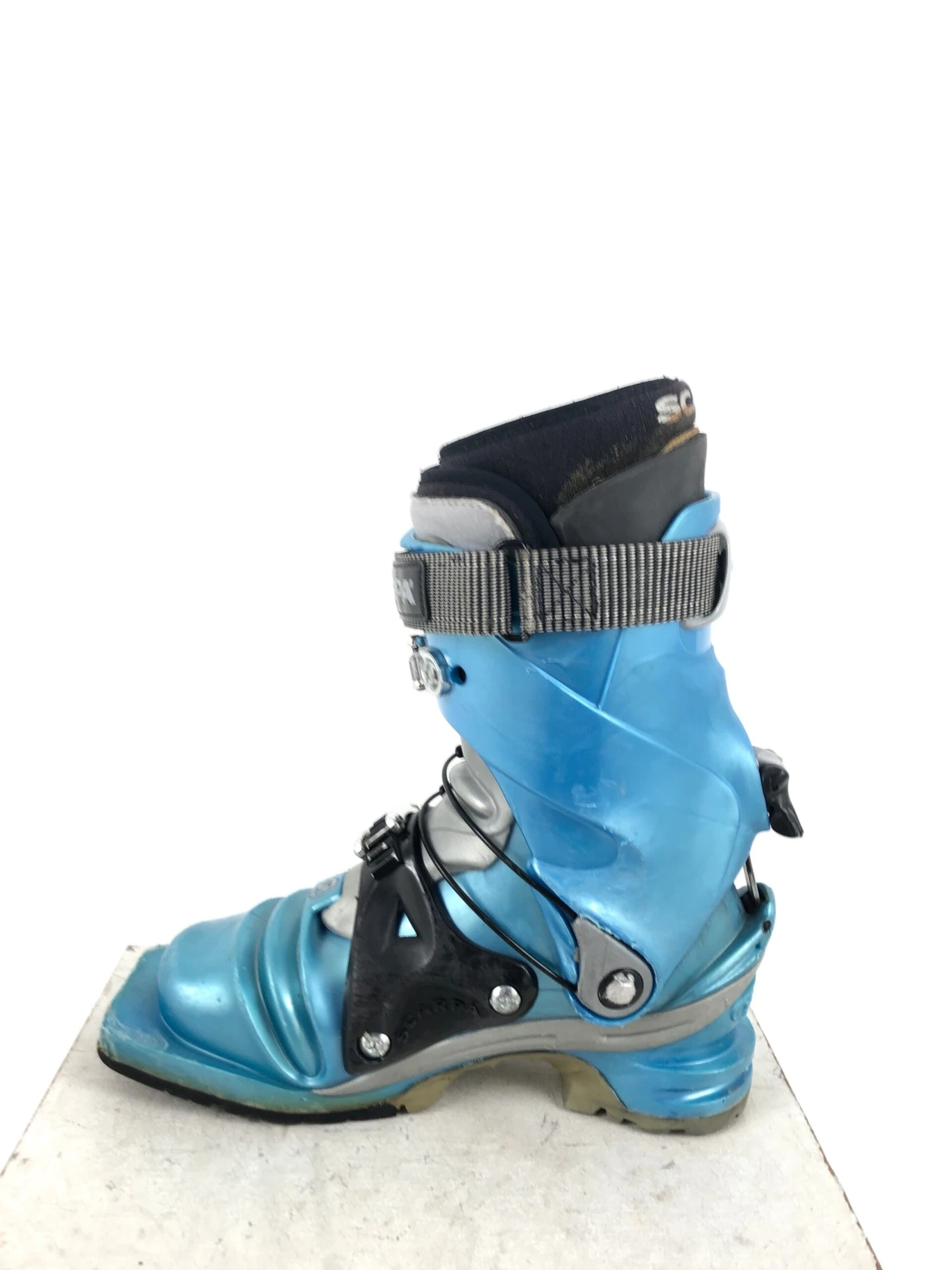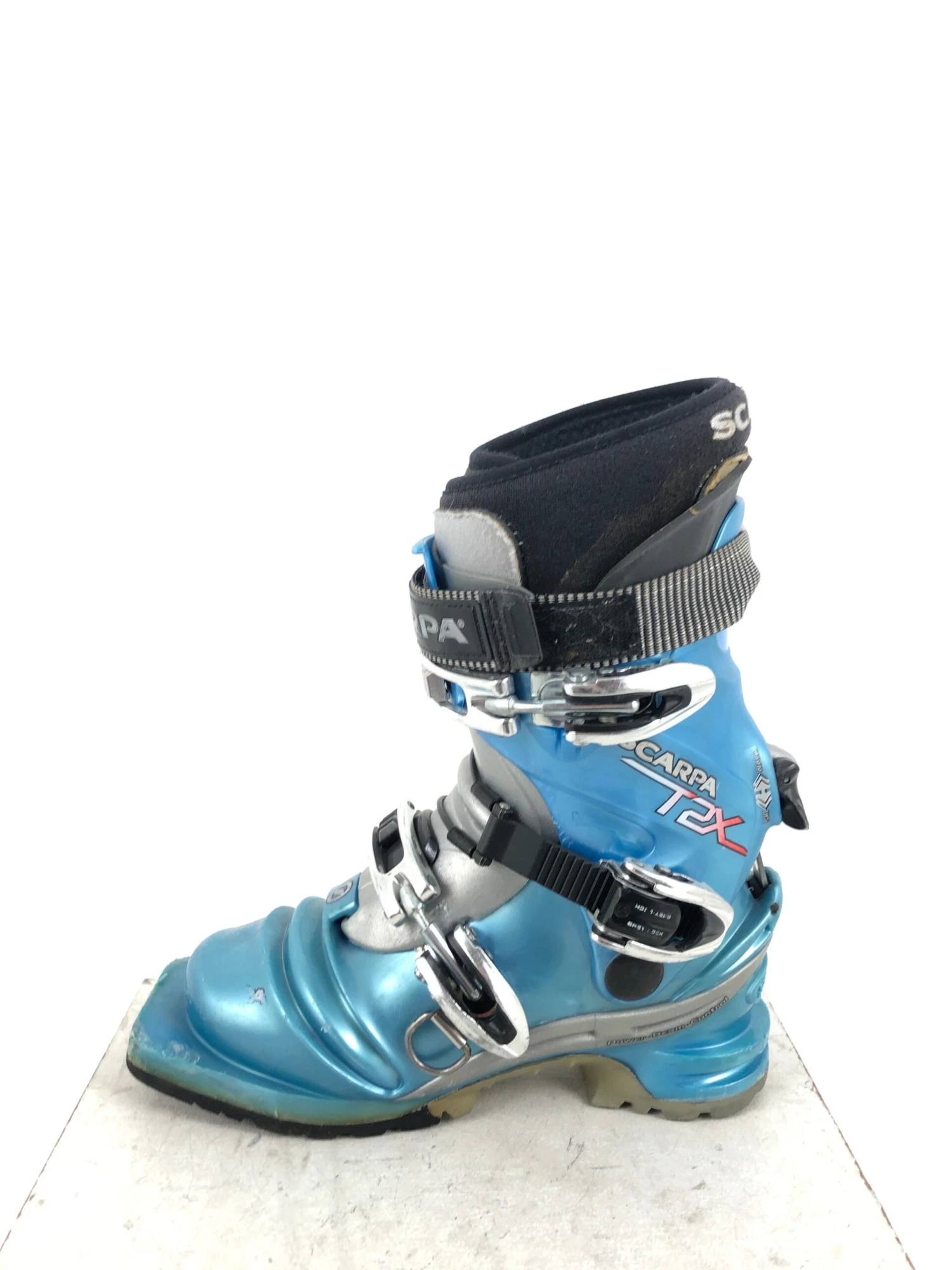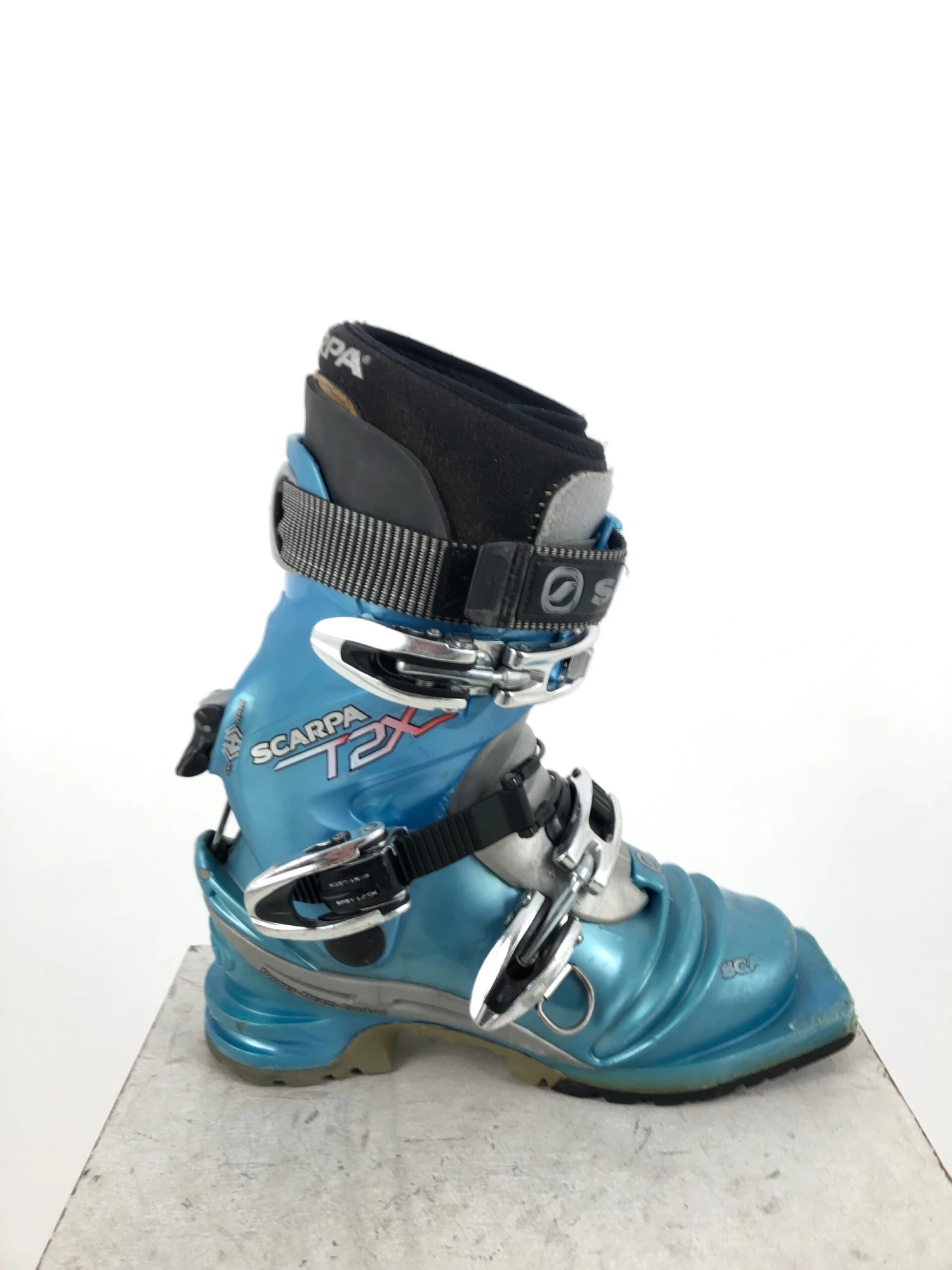 The Scarpa T2x 75mm Telemark Boot has touring flex similar to the original Scarpa T2, but now includes an asymmetric, dual-density cuff for more power and drive in crud and crust. A more robust power strap combines with a higher liner cuff for increased power transmission to the ski; dual-density liner is thermo-moldable. Features a new walk/ski lever adjustable to 18° or 20°; micro-adjustable buckles provide a precise, comfortable fit. Lower boot buckle has been repositioned to take pressure off the instep; now configured with a replaceable scuff guard to prolong the life of boot