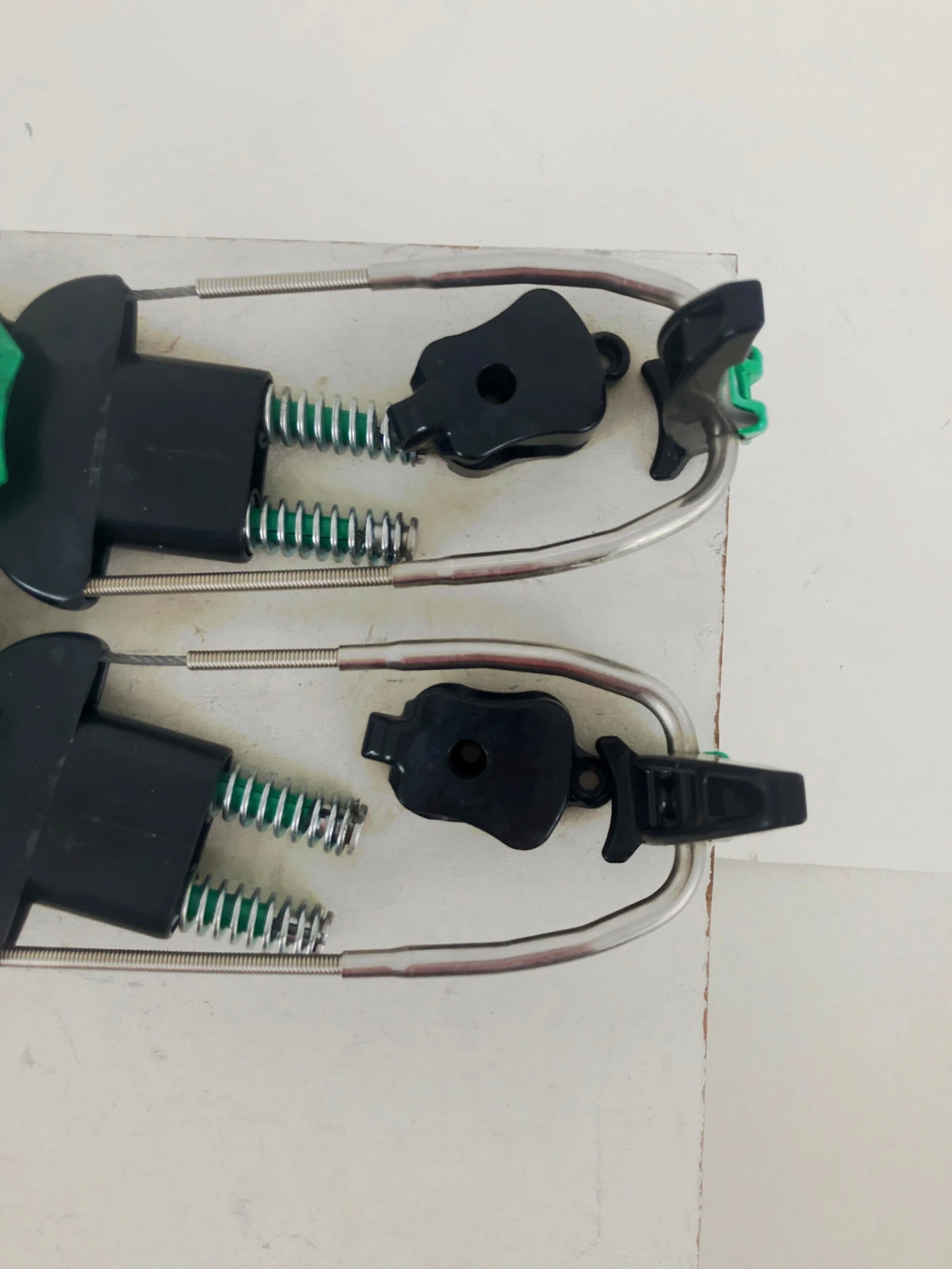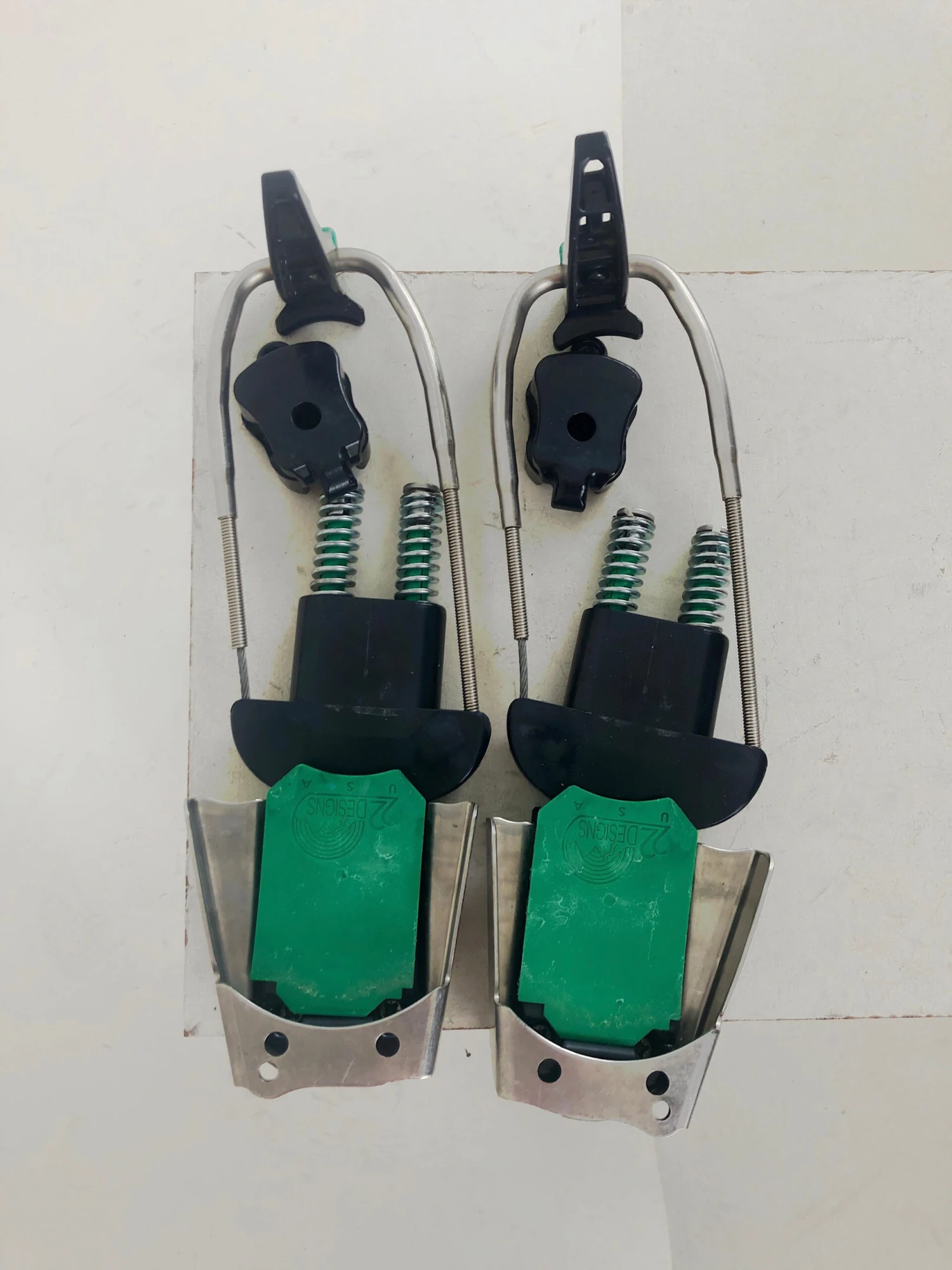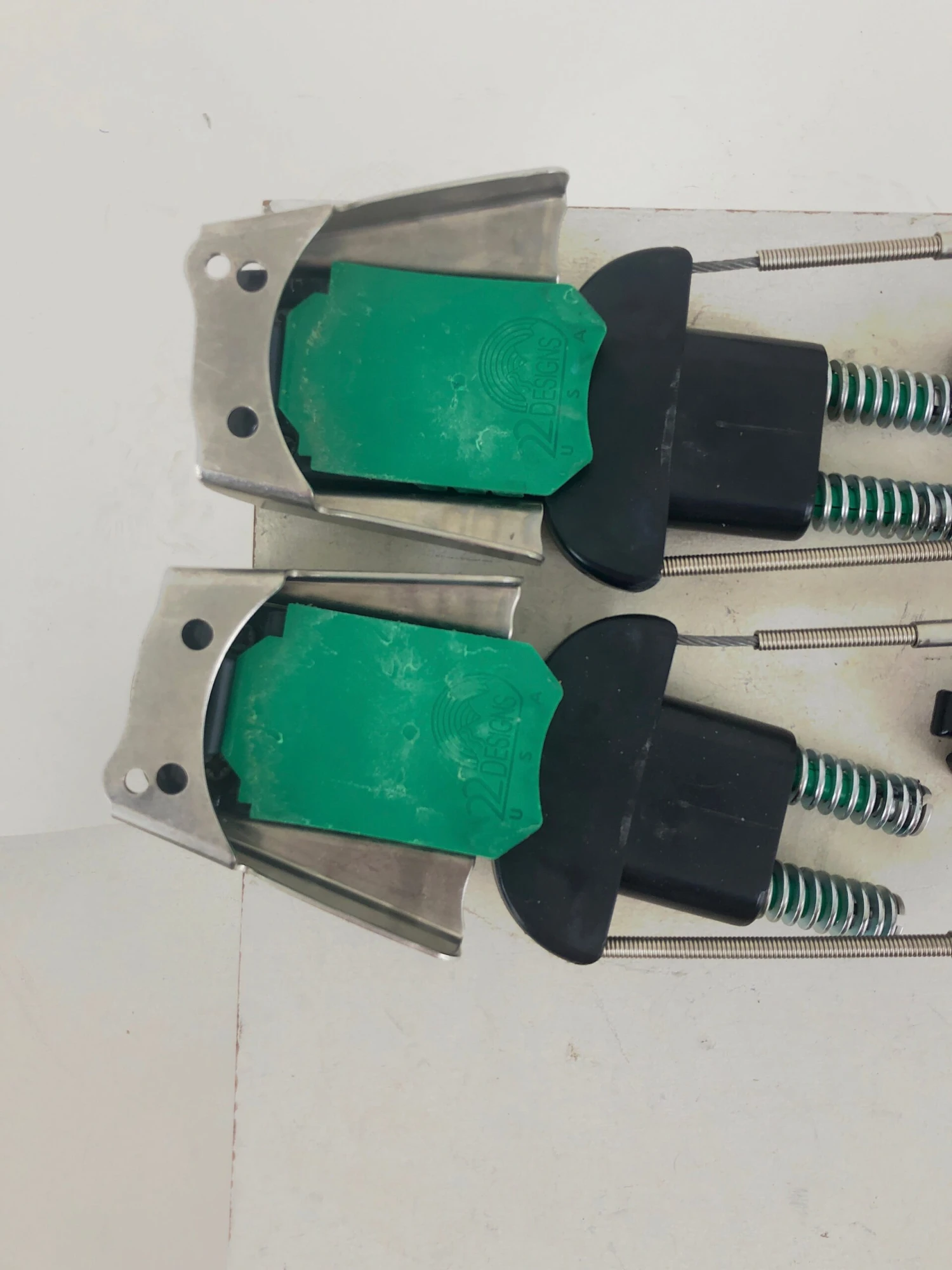 Features-Super durable: 2000 lb test cable attachments won’t break, one-piece stainless steel toepiece.-Over 2″ of spring travel for smooth action and durability.-Cables routed underfoot for maximum control; plastic boots flex at the bellows instead of tip-toeing.-Ultra-secure mounting pattern.-Riser height: 1.0″ or 25mm at rear, with a 2 degree ramp.-Weight: 3.15 lbs per large pair, 3.0 lbs for small.