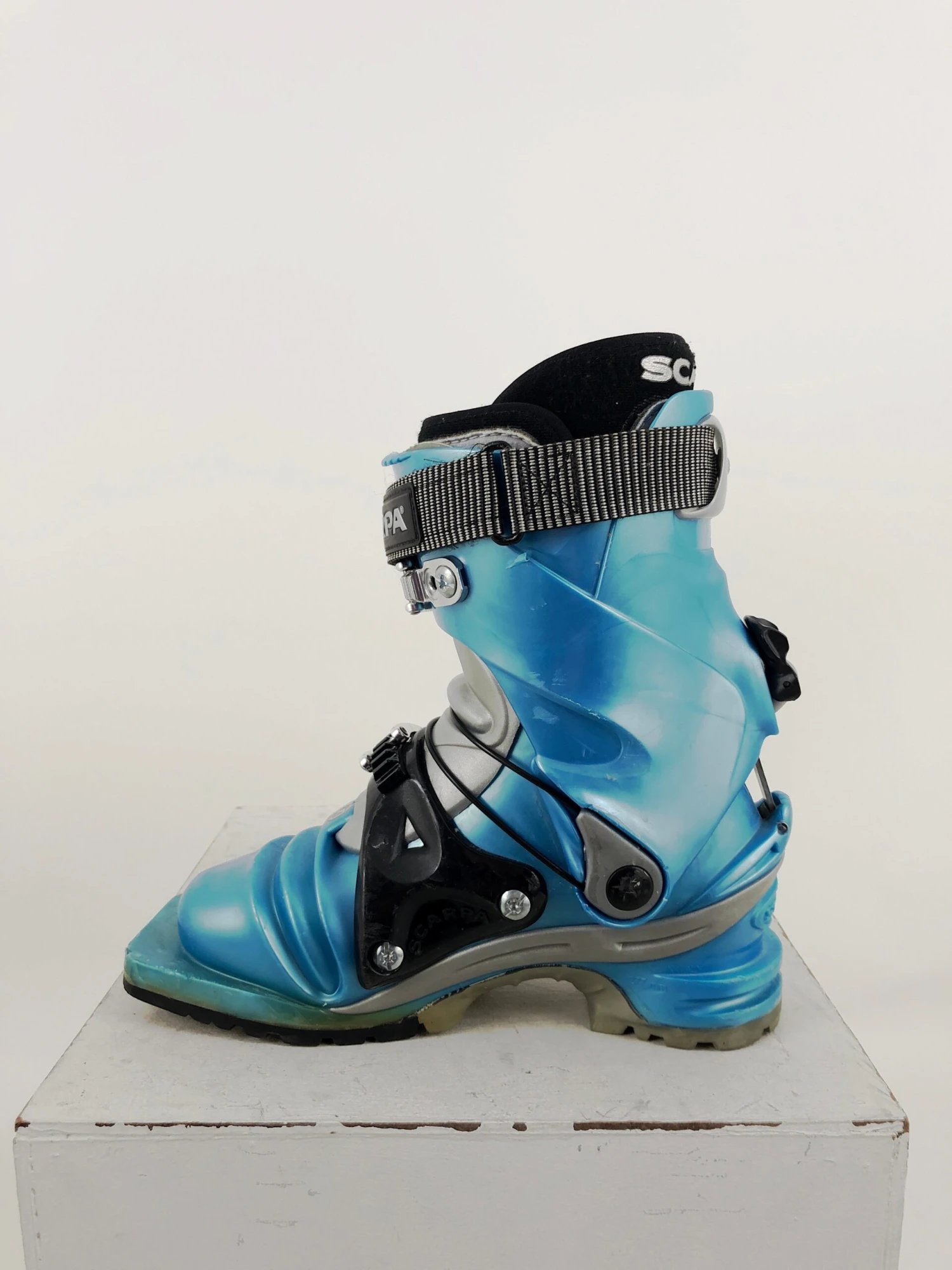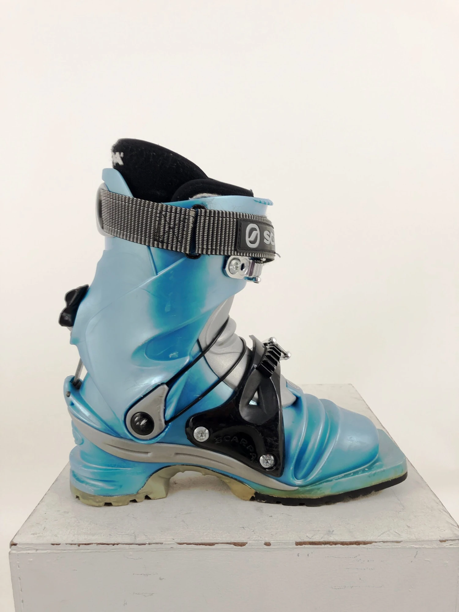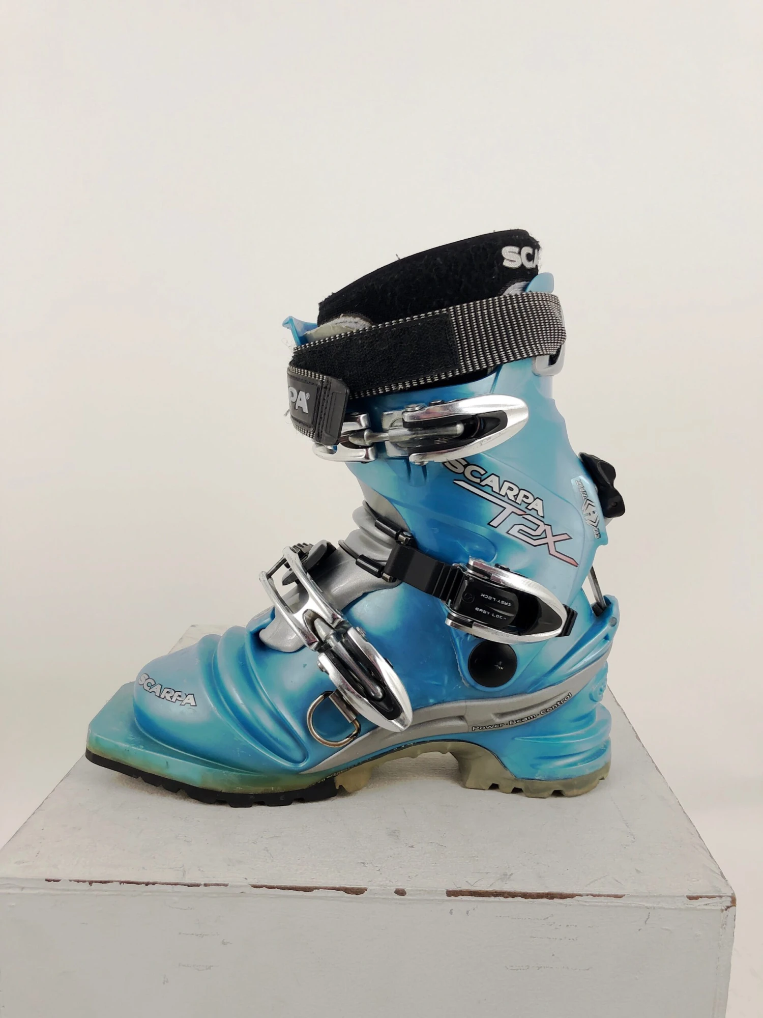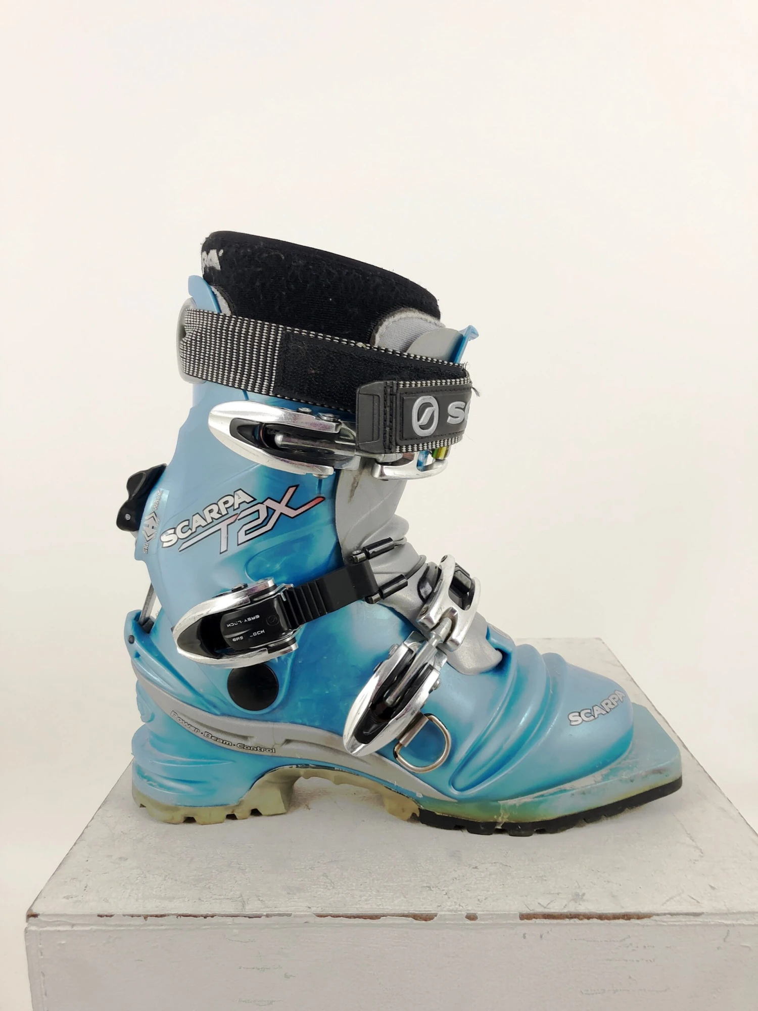 The Scarpa T2x 75mm Telemark Boot has touring flex similar to the original Scarpa T2, but now includes an asymmetric, dual-density cuff for more power and drive in crud and crust. A more robust power strap combines with a higher liner cuff for increased power transmission to the ski; dual-density liner is thermo-moldable. Features a new walk/ski lever adjustable to 18° or 20°; micro-adjustable buckles provide a precise, comfortable fit. Lower boot buckle has been repositioned to take pressure off the instep; now configured with a replaceable scuff guard to prolong the life of boot