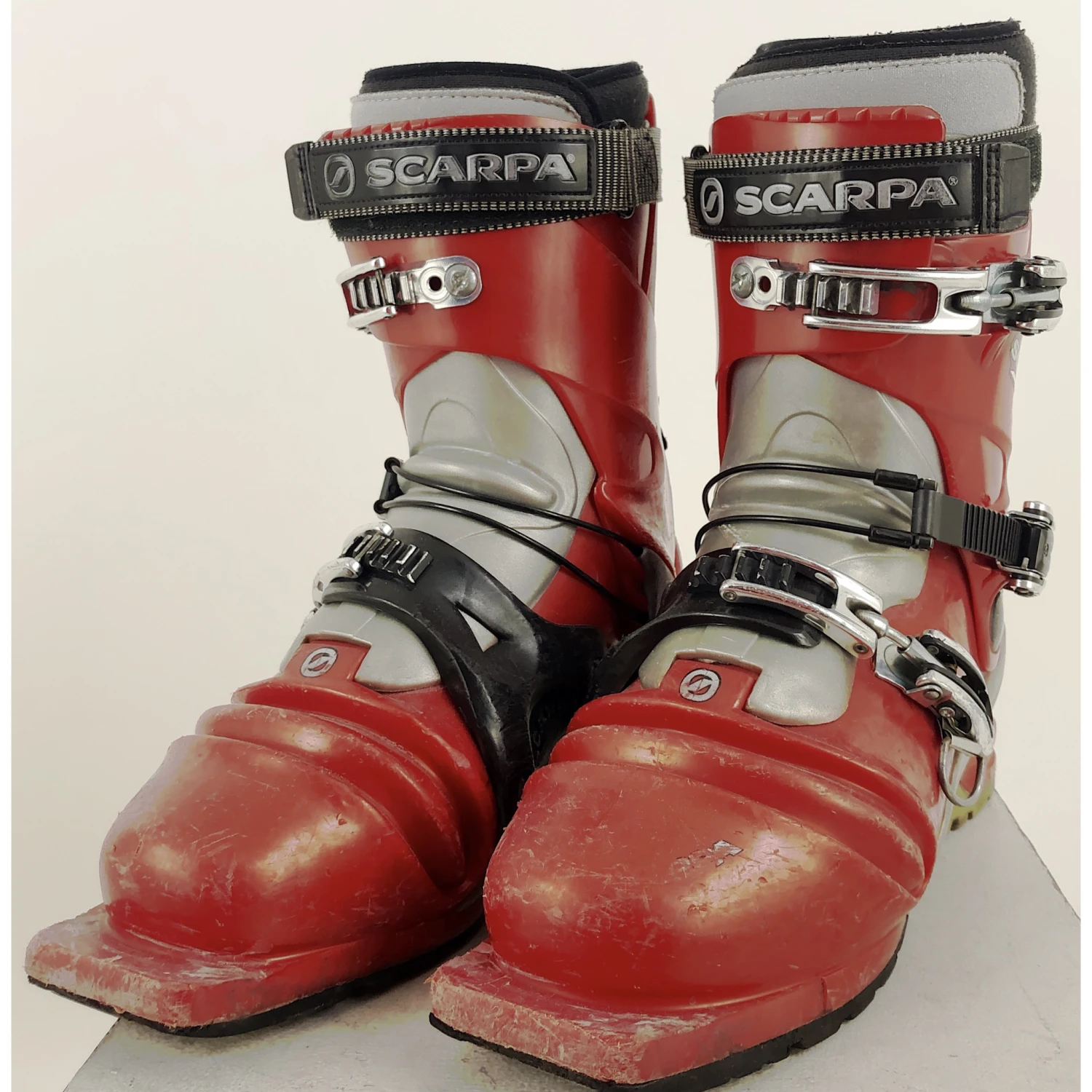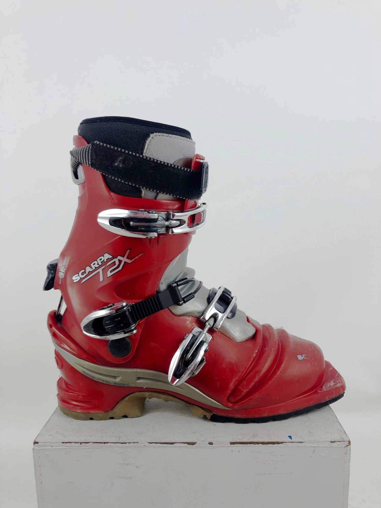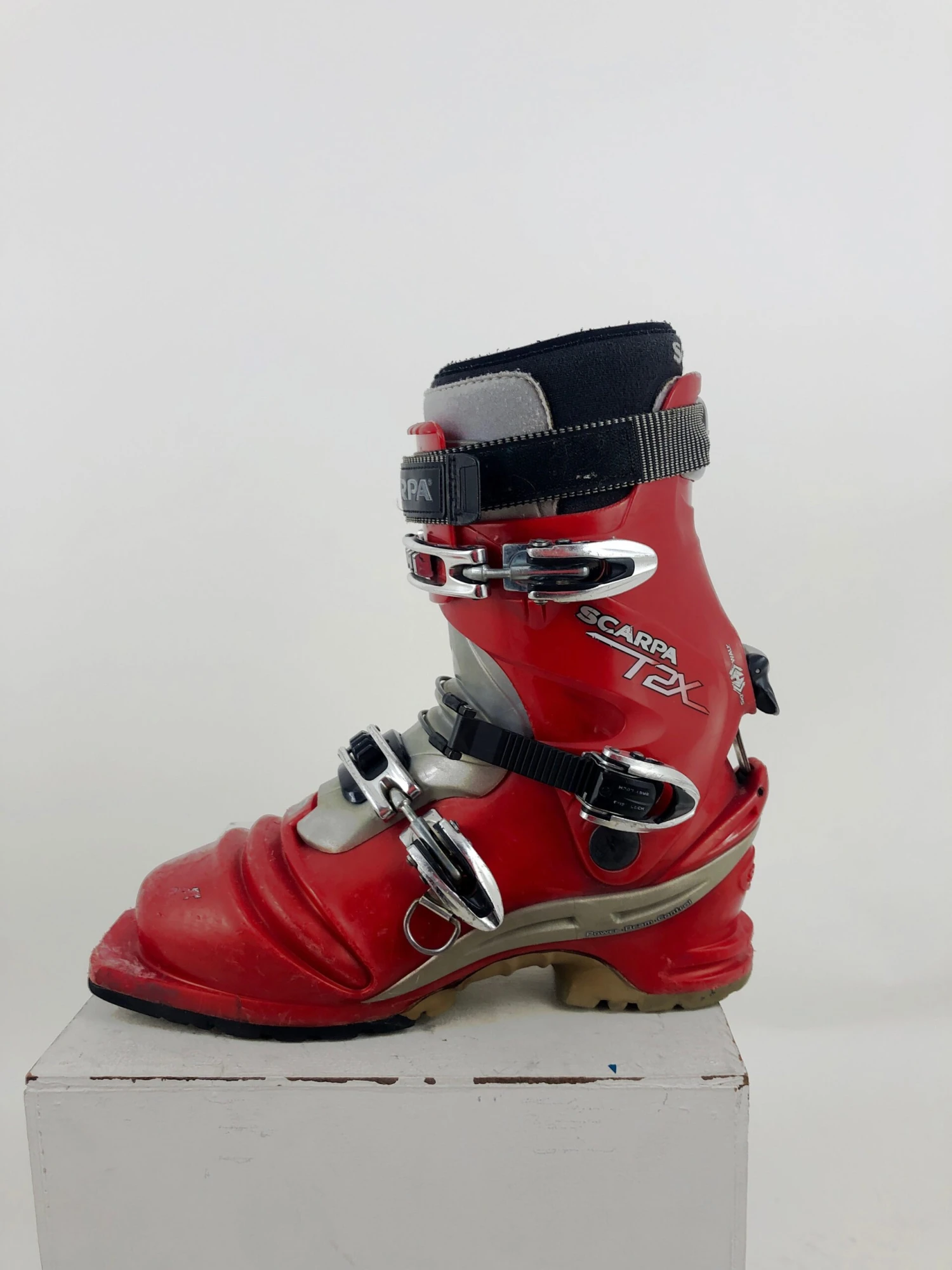 The Scarpa T2x 75mm Telemark Boot has touring flex similar to the original Scarpa T2, but now includes an asymmetric, dual-density cuff for more power and drive in crud and crust. A more robust power strap combines with a higher liner cuff for increased power transmission to the ski; dual-density liner is thermo-moldable. Features a new walk/ski lever adjustable to 18° or 20°; micro-adjustable buckles provide a precise, comfortable fit. Lower boot buckle has been repositioned to take pressure off the instep; now configured with a replaceable scuff guard to prolong the life of boot