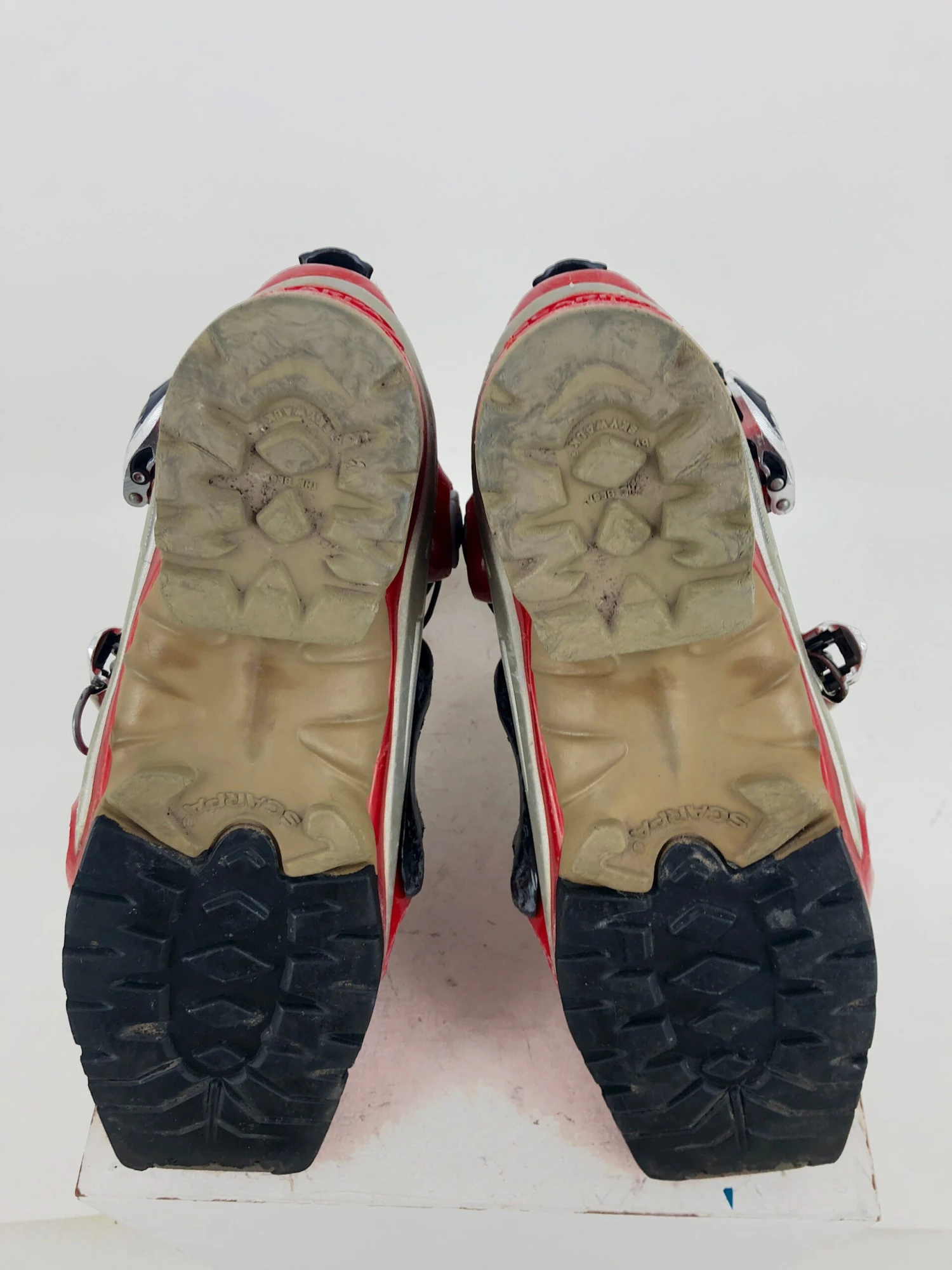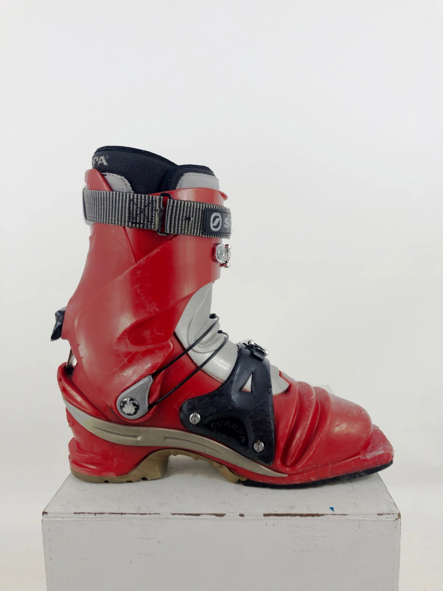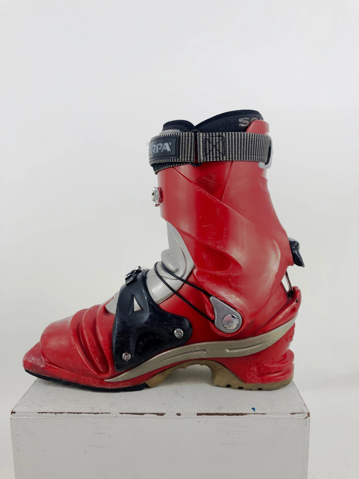 The Scarpa T2x 75mm Telemark Boot has touring flex similar to the original Scarpa T2, but now includes an asymmetric, dual-density cuff for more power and drive in crud and crust. A more robust power strap combines with a higher liner cuff for increased power transmission to the ski; dual-density liner is thermo-moldable. Features a new walk/ski lever adjustable to 18° or 20°; micro-adjustable buckles provide a precise, comfortable fit. Lower boot buckle has been repositioned to take pressure off the instep; now configured with a replaceable scuff guard to prolong the life of boot
